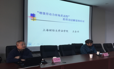 2016年12月5日下午,国内著名劳动法专家、上海财经大学yl23411永利官网登录教授、博士生导师、中国经济法学研究会副会长、中国社会法学研究会副会长、中国劳动法学研究会副会长王全兴教授,应邀来公司作了一场题为“增强劳动力市场灵活性的劳动法解读和应对”的精彩学术讲座。本次讲座由yl23411永利官网登录主办,科研处协办,yl23411永利官网登录副经理李伟教授主持,钱叶芳教授、詹国旗博士等专业老师和一百五十余名员工参加。