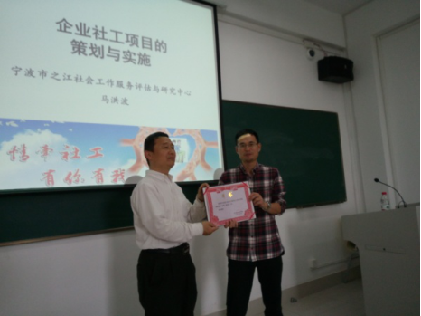 2017年5月9日,yl23411永利官网登录社会工作系邀请了宁波市之江社会工作服务评估与研究中心主任马洪波来到《企业社会工作》课堂,围绕企业社工项目的策划与实施为社工系员工开展了一次别开生面的讲座。在讲课前,社工系主任陈建胜副教授为马洪波颁发了yl23411永利官网登录实务导师荣誉证书。