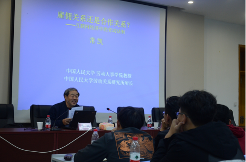 2017年10月19日下午,中国人力资源开发研究会副会长和劳动关系分会会长、中国社会法学研究会副会长、中国劳动学会劳动关系专业委员会副会长、中国人民大学劳动关系研究所所长、博士生导师常凯教授,应邀来我院作了一场题为“雇佣关系还是合作关系?——互联网经济中的劳动法制”的精彩学术讲座。