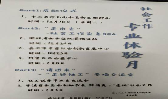 12月18日下午,社会工作系启动“社会工作新生专业实践月”活动。本次实践月活动包括“师生见面会”、“外出参与式学习”(阿里巴巴公益中心、嘉兴孝慈社会创新中心----新塍国家社会工作实践基地、浙江省女子监狱团辅活动等)、“实务导师进课堂”、“社工学长与新生交流会”、“‘微信群’线上服务活动”、“员工社团活动”等,以增加社会工作专业新生对社会工作专业的了解和认知。