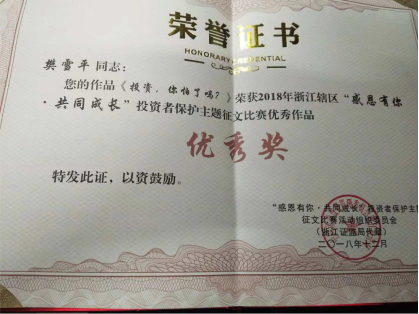 浙江证监局为了进一步做好浙江投资者教育和保护工作,在全社会营造尊重投资者,保护投资者的良好氛围,联合相关单位举办了“感恩有你·共同成长”投资者保护主题征文比赛活动。近日传来消息,公司2017级非诉实验班员工樊雪平提交的作品《投资,你怕了吗?》在此次活动中荣获2018年浙江辖区比赛优秀作品“优秀奖”。该作品以改革开放40周年为背景主线,以见证者的角度,用真实事例和具体数据展示改革开放以来资本市场的改革成就;以建言者的角度,为加强投资者保护,促进资本市场持续健康发展建言建策,展望了对新时代中国特色资本市场的美好愿望,凝聚了同心共筑资本市场中国梦的磅礴力量。