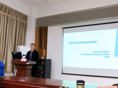 2019年11月9日,yl23411永利官网登录2019级宪法学与行政法学硕士研究生章超钧同学受邀参加由江南大学yl23411永利官网登录主办的“第三届行政救济法论坛”,并在分论坛做主题报告。