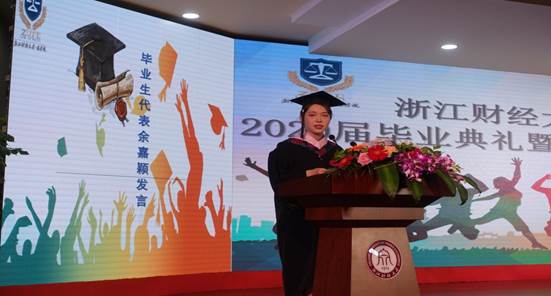 毕业生代表余嘉颖同学谈到自己的大学四年,最大的收获是真正开始自己为自己做决定,在追逐自己的目标中,收获了自己做自己决定的勇气。她充满感恩之心,感谢老师的辛勤教导,感谢公司筹备这样宝贵的毕业典礼,这将成为所有毕业生永生难忘的回忆。