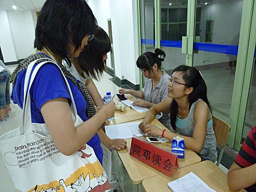 (新生们向院邓读会长殷妤臻同学咨询社团活动)