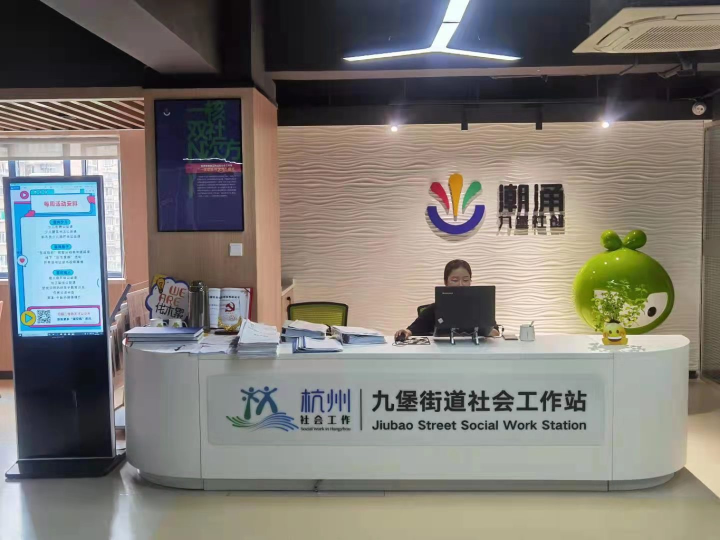 在九堡街道党群服务中心,同学们参观了社工站的崭新设施,通过中心主任的讲解,了解了社工站的“潮涌”品牌、发展历史和工作模式。为解决“企业不知道怎么做公益”、“政府全面兜底难”、“社会组织资源不足”的问题,社工站的“潮涌社创”将本地小微企业、社会组织与公益活动相结合,打造了“政、社、企”协同发展的新模式。