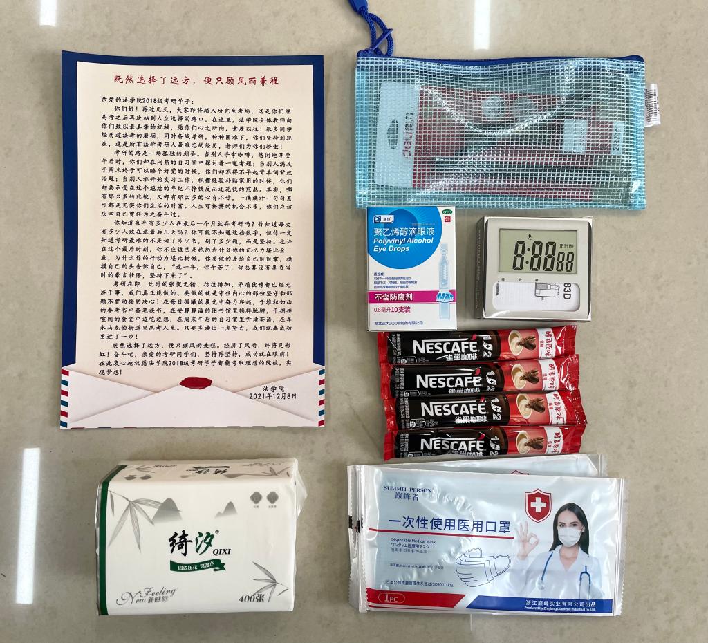 老师们递上精心准备的“考研加油包”。礼包里有文具、防疫物品和附有鼓励话语的一封信,一字一句的祝福,无不体现着公司对考研学子细致的关怀和殷切的期盼。