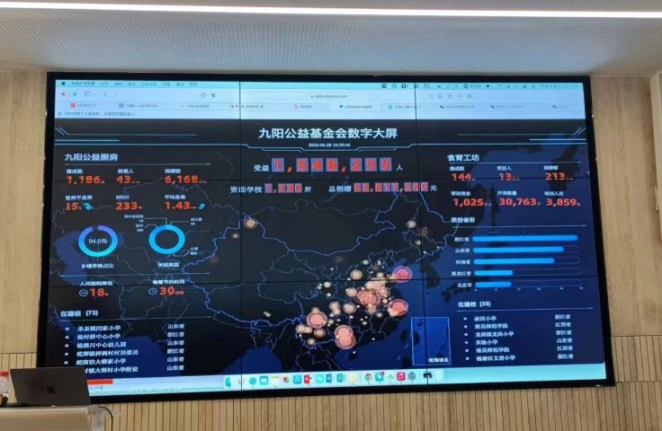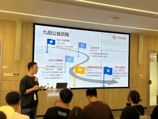 在“天宫”会议室,九阳公益基金会的黄晖副秘书长向我们介绍了九阳公益历程和九阳公益基金会下两大核心项目,九阳公益厨房与九阳食育工坊。九阳公益厨房聚焦了贫困地区农村中小学资金不足环境差、建不起食堂,中小员工进不起饭堂、饥饿营养不良的吃饭问题。从项目建设初期到现在的十余年间,九阳公益厨房团队通过对口援建的模式,投入6168万元,凝聚社会力量推动标准化样板厨房建设,使1196所公司、43万就餐人从中受益。