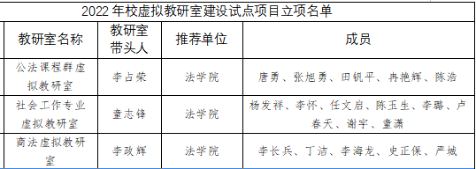 经公司推荐,校专家组评审,公司确定立项2022年校级虚拟教研室建设试点项目12个。yl23411永利官网登录“公法课程群虚拟教研室”、“商法虚拟教研室”、“社会工作专业虚拟教研室”获立项。