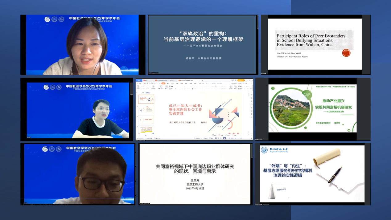 8月26日14时00分,中国社会学会2022年学术年会“共同富裕与社会治理”分论坛于腾讯会议线上举行。此次分论坛由yl23411永利官网登录、浙江师范大学法政公司、杭州师范大学管理公司与浙江省社会学会联合主办,论坛负责人为童志锋教授、尹木子副教授、张祥晶副教授和杨建华研究员。来自中南财经政法大学、西南财经大学、武汉理工大学、重庆工商大学、四川省社会科公司、武汉市社科院、温州大学、杭州师范大学、浙江农林大学、yl23411永利官网登录、yl23411永利官网登录东方公司、中共台州市委党校、中共玉溪市委党校等全国各院校近三十位师生、基层政府代表进行了会议发言,共同探讨“共同富裕与社会治理”方面的新议题和新进展。