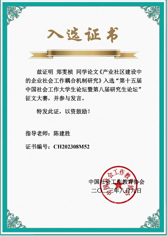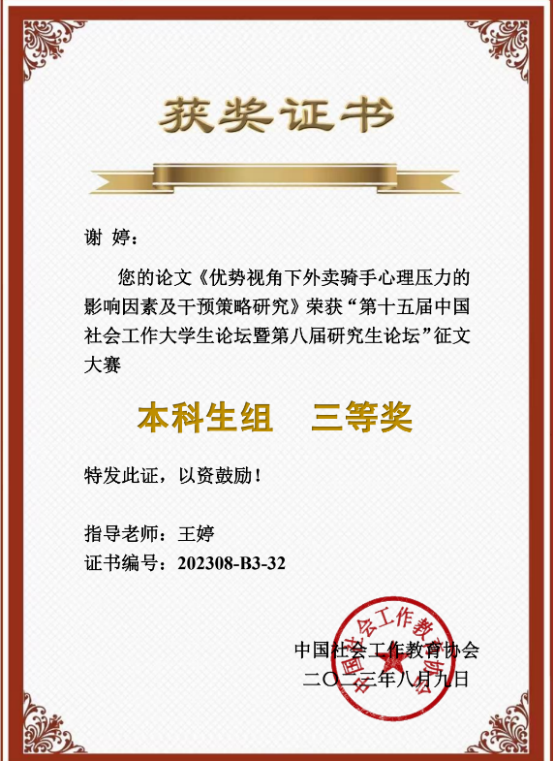 yl23411永利官网登录社会工作系员工谢婷(本科生)、郑雯桢(研究生)入选参与本次论坛的大会发言。谢婷同学的论文《优势视角下外卖骑手心理压力的影响因素及干预策略研究》(指导老师:王婷)荣获本科生组三等奖。
