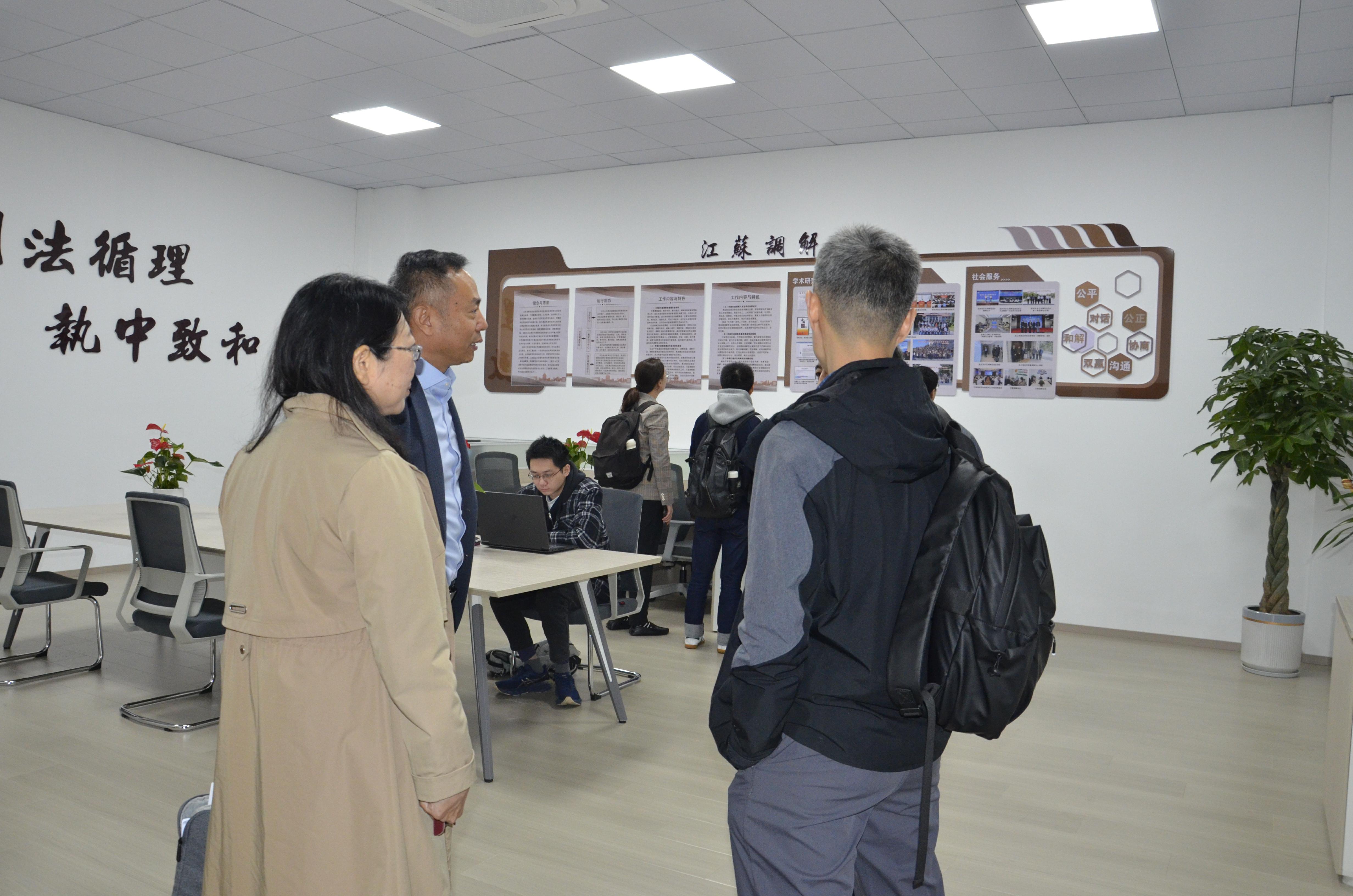交流会结束后,调研组在花瑞锋书记和曲昇霞经理陪同下,一起参观了江苏调解公司办公场所、扬州市多元调解促进会,并与派驻法官、实习员工进行交流。