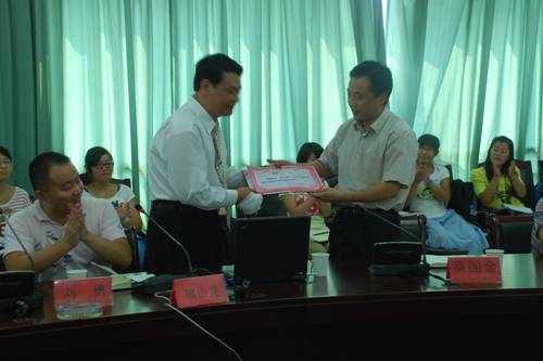 公司党总支书记蔡国金为福山龙教授颁发了客座教授聘用证书,并为其佩戴公司校徽。法律