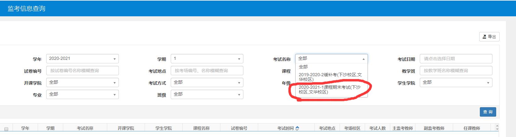具体查看途径:信息门户-教务系统-信息查询-监考信息查询-考试名称选择(期末监考)详情请见下图