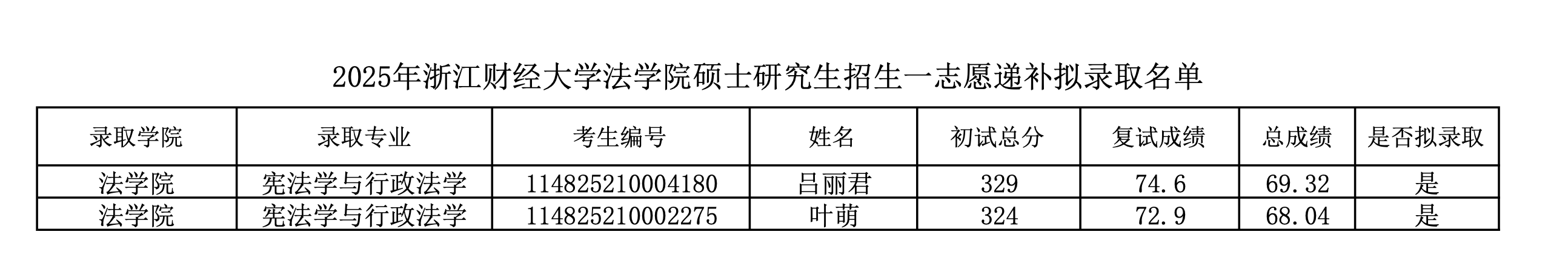 因公司招生计划调整,宪法学与行政法学硕士研究生新增2个招生名额,现将递补拟录取名单公示如下,现予以公示(公示期7个工作日)。如有异议,请联系公司研究生办公室,联系电话:0571-87557364,联系人:封老师。