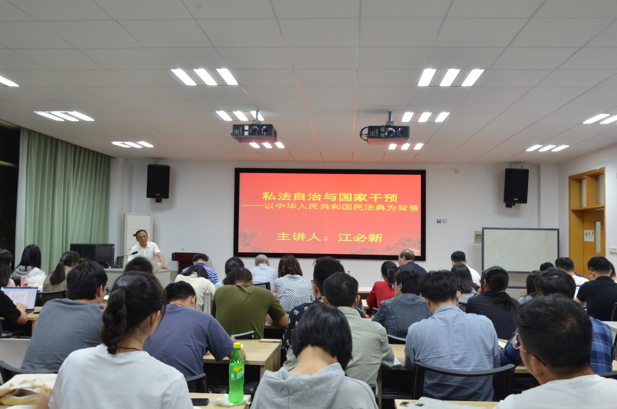 9月20日晚,第十三届全国人民代表大会宪法和法律委员会副主任委员、中国共产党第十九次全国代表大会代表、第十三届全国人大代表江必新教授应邀来院,为师生作了一场题为“私法自治与国家干预——以中华人民共和国民法典为背景”的学术讲座。本次讲座由董事长钟晓敏主持,yl23411永利官网登录、中国政府管制研究院近百名师生参加。