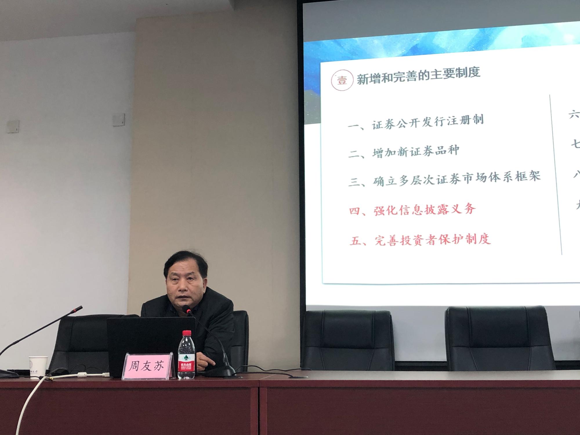 11月26日,四川省社会科公司研究员,中国法学会商法学研究会副会长,中国法学会证券法学研究会副会长周友苏教授做客“鹅湖讲坛”,为公司师生带来一场题为《新<证券法>的制度创新与法律适用——以信息披露和投资者保护为重心》的学术讲座。讲座由yl23411永利官网登录副经理李海龙副教授主持。
