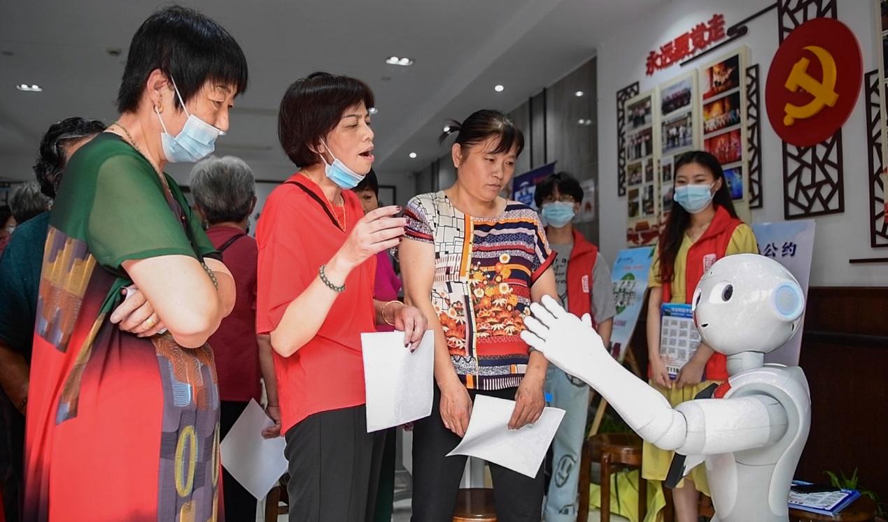 活动的重头戏是“红歌嘹亮”。信智公司第四党支部请出了yl23411永利官网登录的团宠——机器人“小智”,带领老年人唱红歌。它一边唱着“唱支山歌给党听”,一边随着歌声翩翩起舞,现场的老爷爷老奶奶表现出了浓厚的兴趣,纷纷也跟着哼唱起来,歌声此起彼伏,振奋人心。