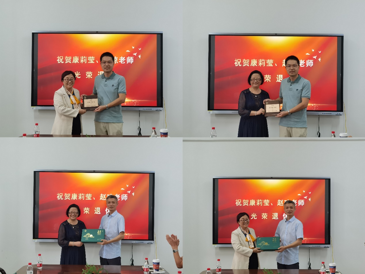 荣休仪式首先以小短片形式回顾了两位老师几十年如一日,为公司事业发展、员工成长成才甘心奉献、默默耕耘的工作点滴。公司经理唐勇和公司党委书记丁洪分别为两位荣休教师送上荣休纪念牌和公司精心准备的荣休礼物,高度评价了两位老师在教学科研、人才培养及公司发展等方面的付出与贡献,希望荣休老师们能继续为公司的发展建言献策。