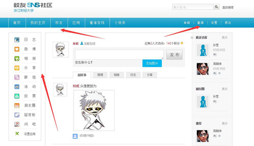 3、账号登陆后,如下图所示,对于个人而言,员工可以发日志、微博、上传相册、建立群组,发起活动等功能;员工还可以邀请其他员工至该社区,共同交流。同时,还有员工版块,可以更改自己的信息,查询自己的同班员工信息,加强员工与员工之间的联系和感情。