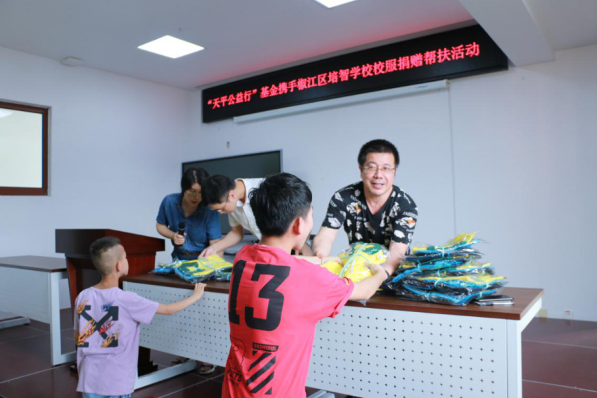 同学们纷纷穿上新校服,校服的左胸口印着集团校徽,右袖口印着“天平公益行”基金的logo,能力较强的同学们帮助行动不便的同学换上校服,场面十分感人,看到实时发送的照片,“天平公益行”基金成员纷纷在微信群里点赞。