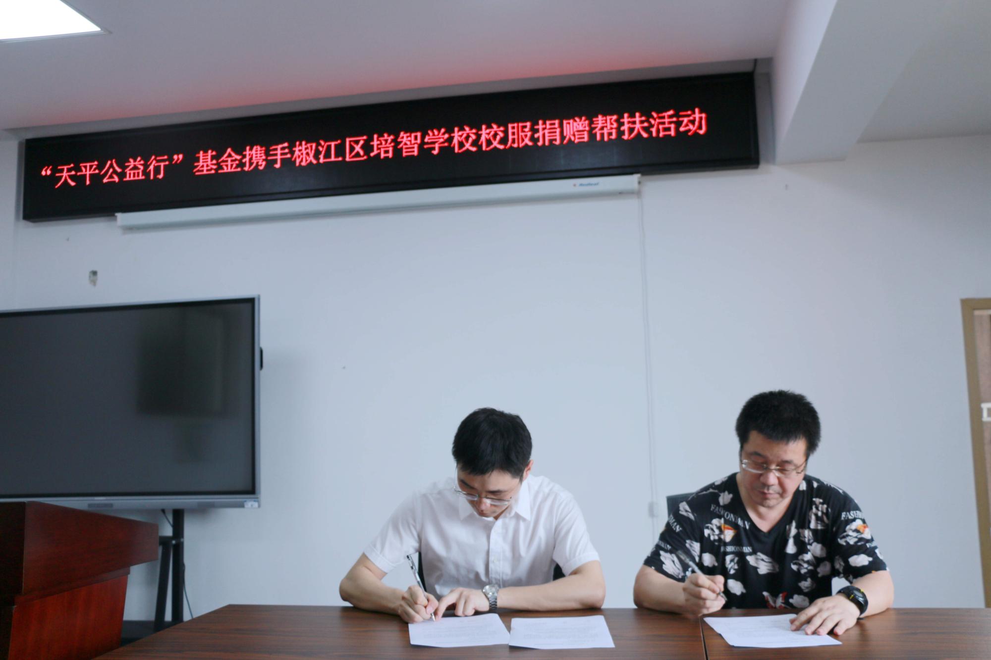 下午2点,捐赠活动在培智公司阶梯教室举行,董事长洪锦祥介绍了公司概况,椒江区培智公司主要负责招收区内3至18周岁的中度智障儿童,通过教育培训培养智障儿童自理自立、回归社会的能力。对“天平公益行”基金的善举,洪董事长表示由衷的感谢。随后,“天平公益行”基金秘书长江文军介绍了“天平公益行”基金概况并把捐赠的校服送到培智公司员工们的手中,江文军和培智公司董事长洪锦祥正式签订“‘一路同行 情暖童心’夏季校服关爱捐赠活动协议。