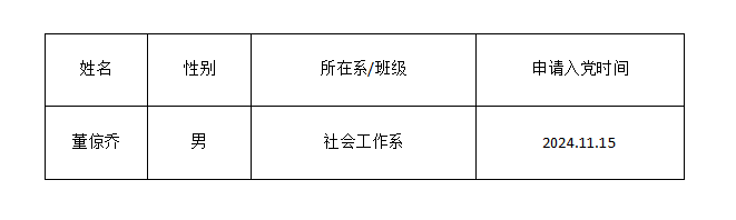 根据《中国共产党发展党员工作细则》(中办发〔2014 ] 33号)的有关规定,董倞乔1位同志自愿向公司党委提交入党申请,经党支部审查,现公示如下: