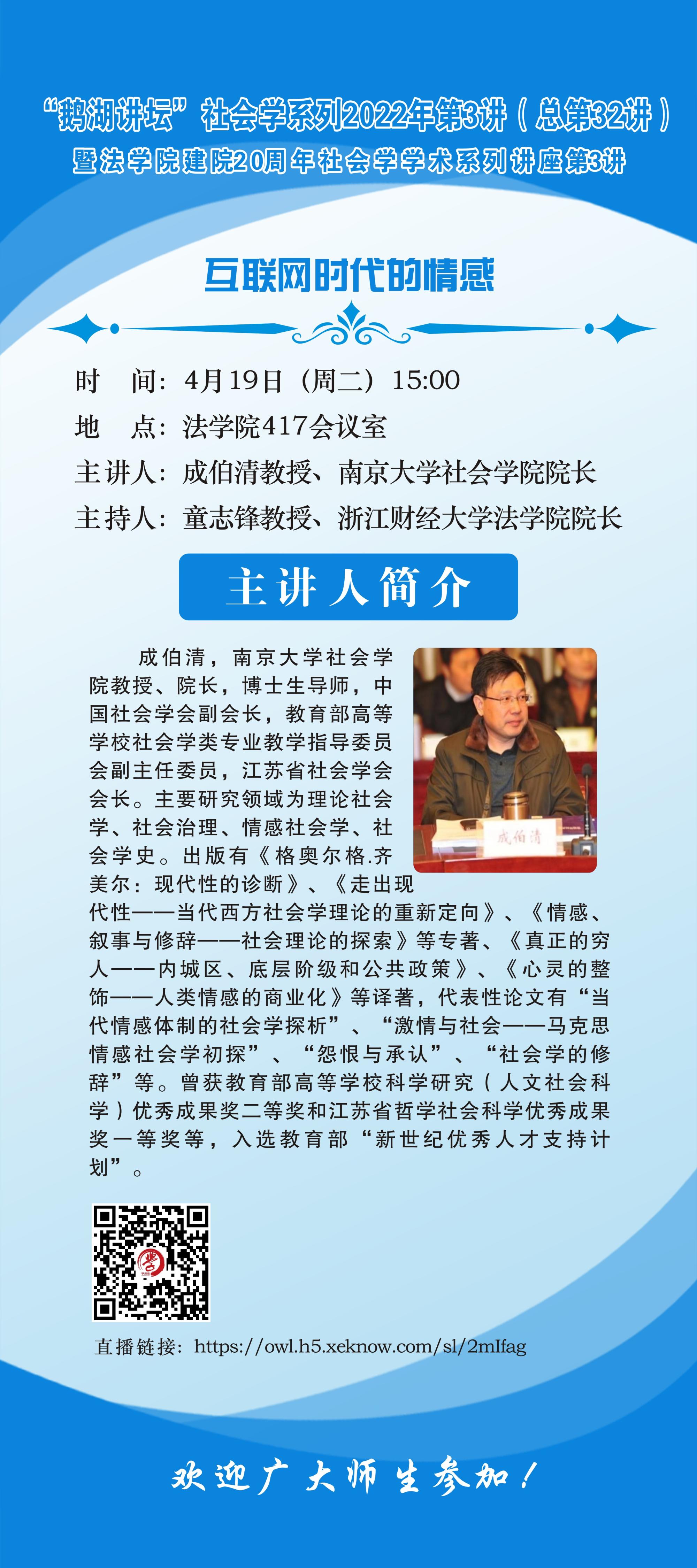 “鹅湖讲坛”社会学系列2022年第3讲暨yl23411永利官网登录建院20周年社会学学术系列讲座第3讲南京大学成伯清教授