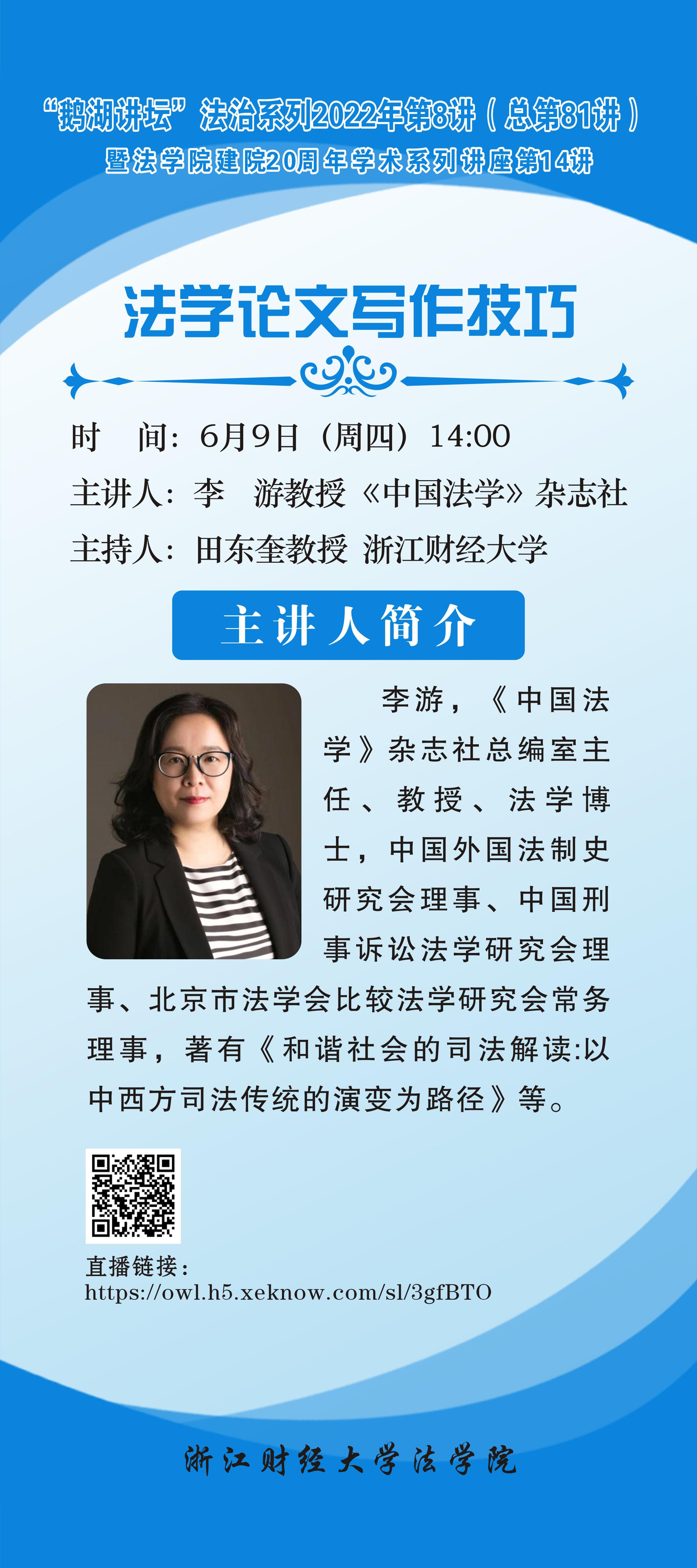 “鹅湖讲坛”法治系列2022年第8讲暨yl23411永利官网登录建院20周年学术系列讲座第14讲李游教授