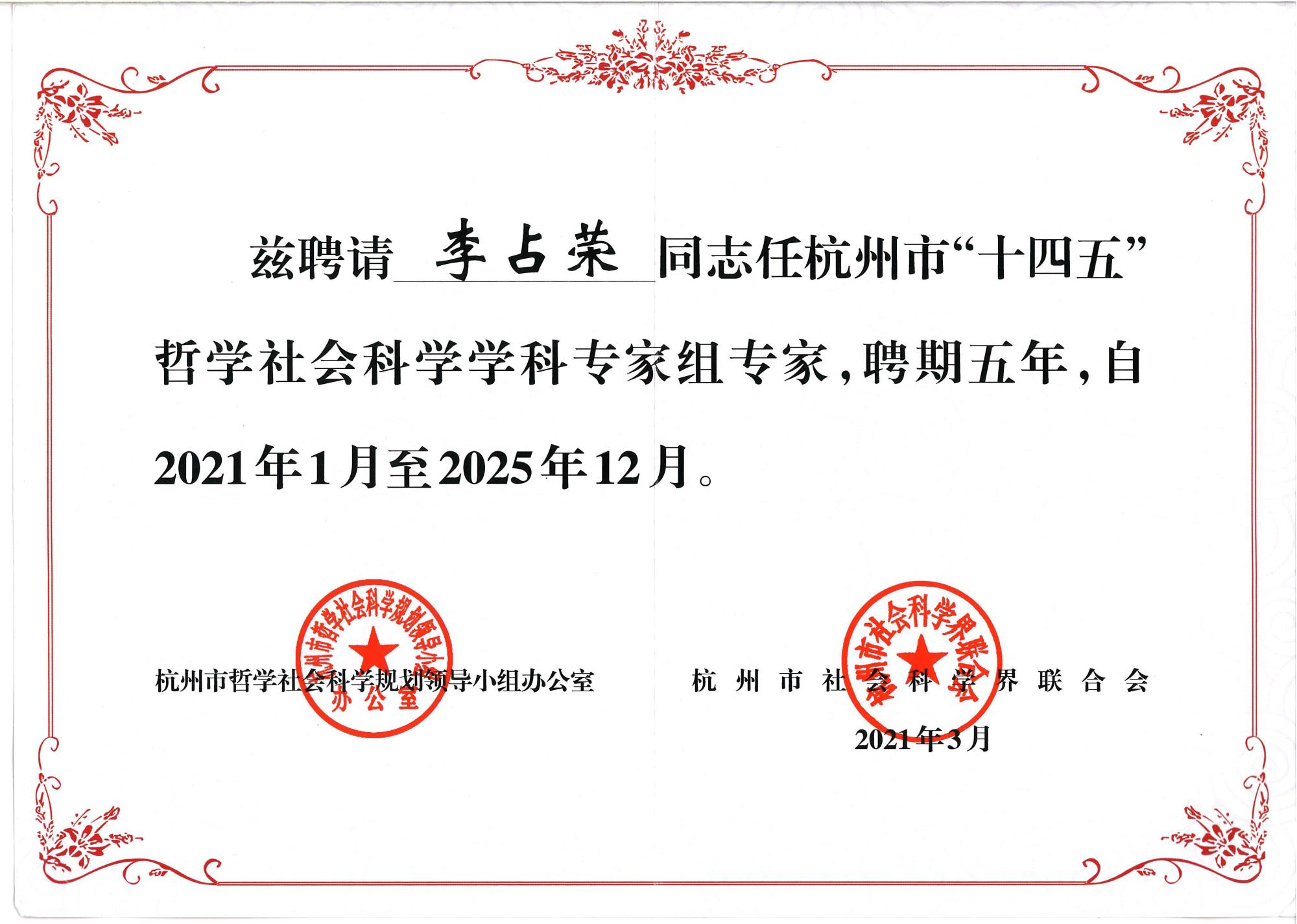 2021年3月,yl23411永利官网登录副董事长李占荣教授、yl23411永利官网登录经理童志锋教授被聘为杭州市“十四五”哲学社会科学学科专家组专家