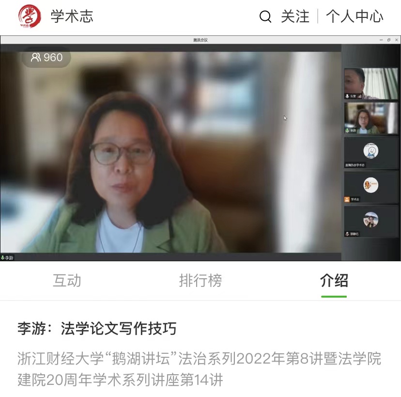 6月9日,《中国法学》杂志社总编室主任李游教授做客鹅湖讲坛,为公司师生带来一场题为“法学论文写作技巧”的学术讲座。本次讲座是yl23411永利官网登录建院20周年学术系列讲座第14讲,由yl23411永利官网登录田东奎教授主持,近千名观众在线聆听了本次讲座。李游教授从论文选题、写作步骤和投稿技巧三方面展开,从选题思路、大纲构建、引证规范、内容提要、研究方法等各个方面对法学论文的写作与技巧进行了全面系统的讲解。李游教授结合自身写...