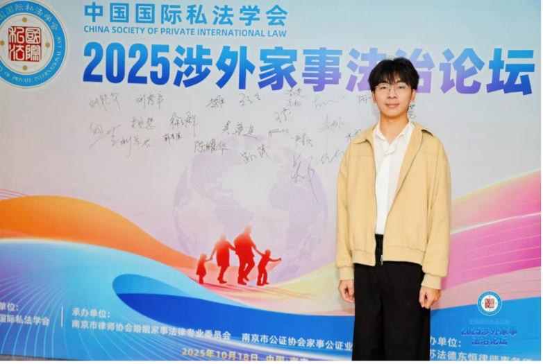 2025年10月18日,“中国国际私法学会2025涉外家事法治论坛”在南京成功举办。本次论坛由中国国际私法学会主办,南京市律师协会婚姻家事法律专业委员会与南京市公证协会家事公证业务委员会共同承办,江苏法德东恒律师事务所协办。来自全国各地的百余位高校学者、执业律师及公证人员齐聚一堂,围绕涉外家事法治的前沿议题与实务难题展开深入交流。公司国际法系硕士研究生费俊才参与本次论坛,并在论坛第三单元“涉外父母子女关系...
